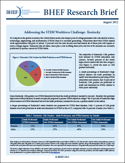 This issue brief explores the STEM workforce challenge in Kentucky, where 70% of high school seniors lack interest in STEM fields.